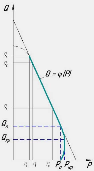 Рис.1. Характеристика зависимости Q от P центробежного насоса.